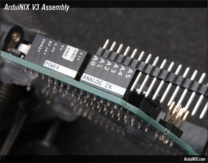 With a pair of needlenose pliers or cutters, cut the rail at the sixth pin, and move the six-pin rail from the ANALOG IN header over to the POWER header.