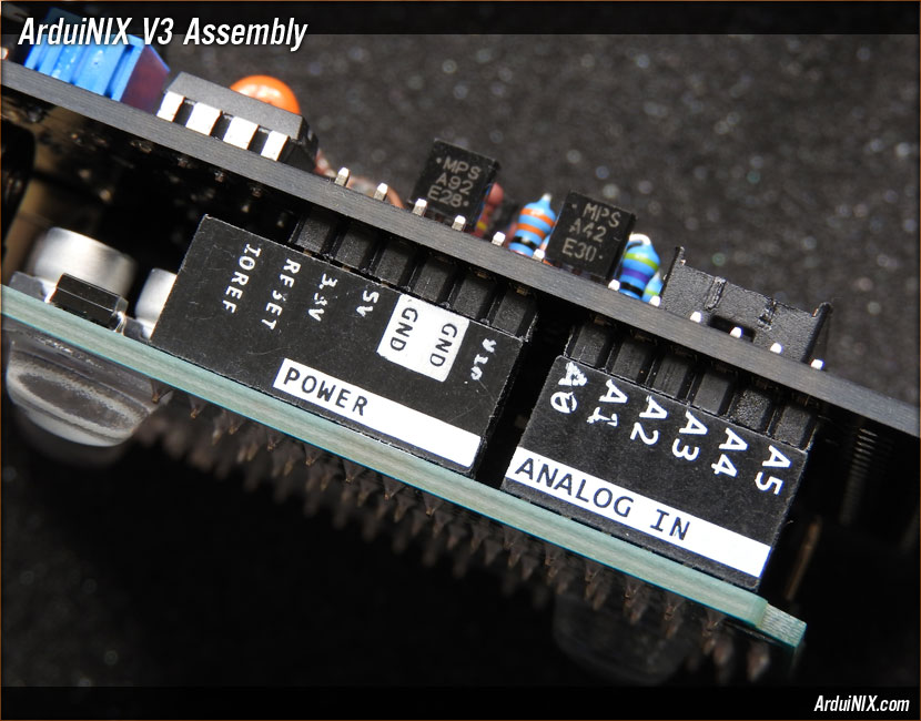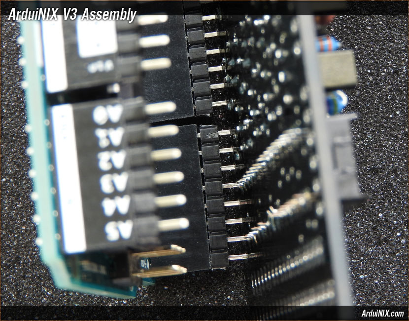 This is the data side properly mated. Here you can see the ten-pin rail section on the "SCL" to "8" data header. Once the boards are mated, solder the pins at their tabs on the top surface of the ArduiNIX Shield. Take care not to use too much solder, and not to short out any pins with their neighbors. V3 Assembly Steps: 0 1 2 3 4 5 6 7 8 9 10 11 12 13 14 15 16 17 18 19 20 21 22 23 24 25 26 27 |